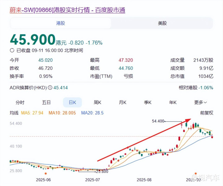 李斌的算盘很精,用资本市场的钱,换盈利的时间窗口。事实上,蔚来不仅在融资方面喜讯频传,而且其股价也表现很好。过去两个月,蔚来股价仅需上行通道,不断攀升。7月初,蔚来港股股价在25元左右,到了9月初已经涨至50多元。换而言之,蔚来港股股价两个月翻番暴涨100%,市值增长一倍。资本的嗅觉是最灵敏的,如此疯狂地买进买入蔚来,当然是有原因的。